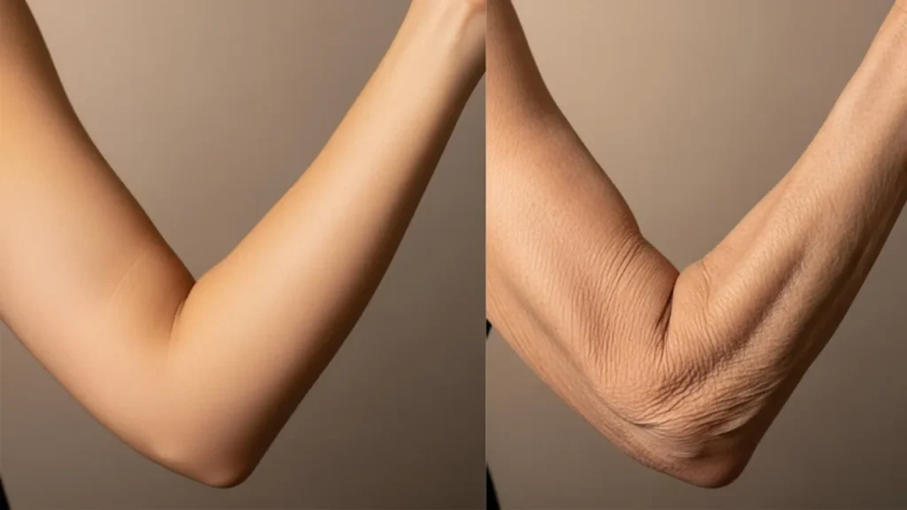 When these fibers get broken down, the skin in the arms starts looking loose, somewhat thin, and crinkly, particularly near the elbows and upper-arm areas.