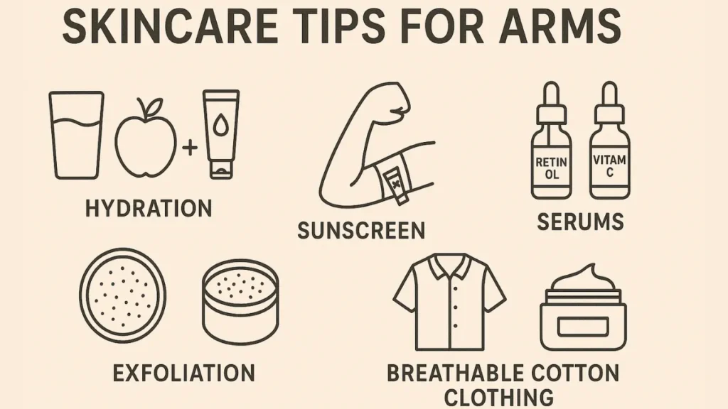 Drink at least 3–4 liters of water a day. Pair this up with water-rich foods like cucumber, watermelon, and citrus fruits. Keeping it outside, apply humectant-rich moisturizer on arms twice a day.
