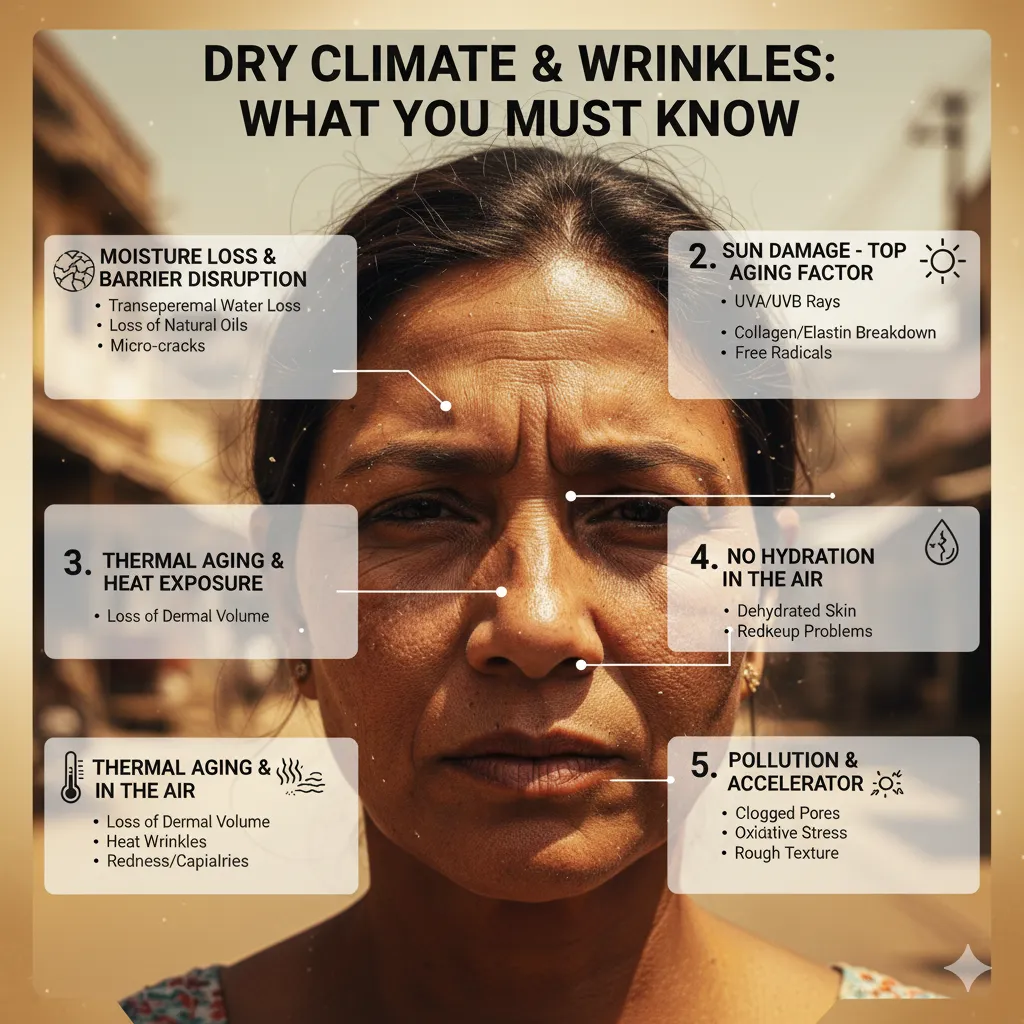 Dry climates like Raipur generally call for more than just generic anti-ageing solutions. Combined with severe UV rays, low humidity, and environmental pollutants constitutes a rapid acceleration of collagen degradation, the deepening of wrinkles, dehydration, and fragility of the skin.