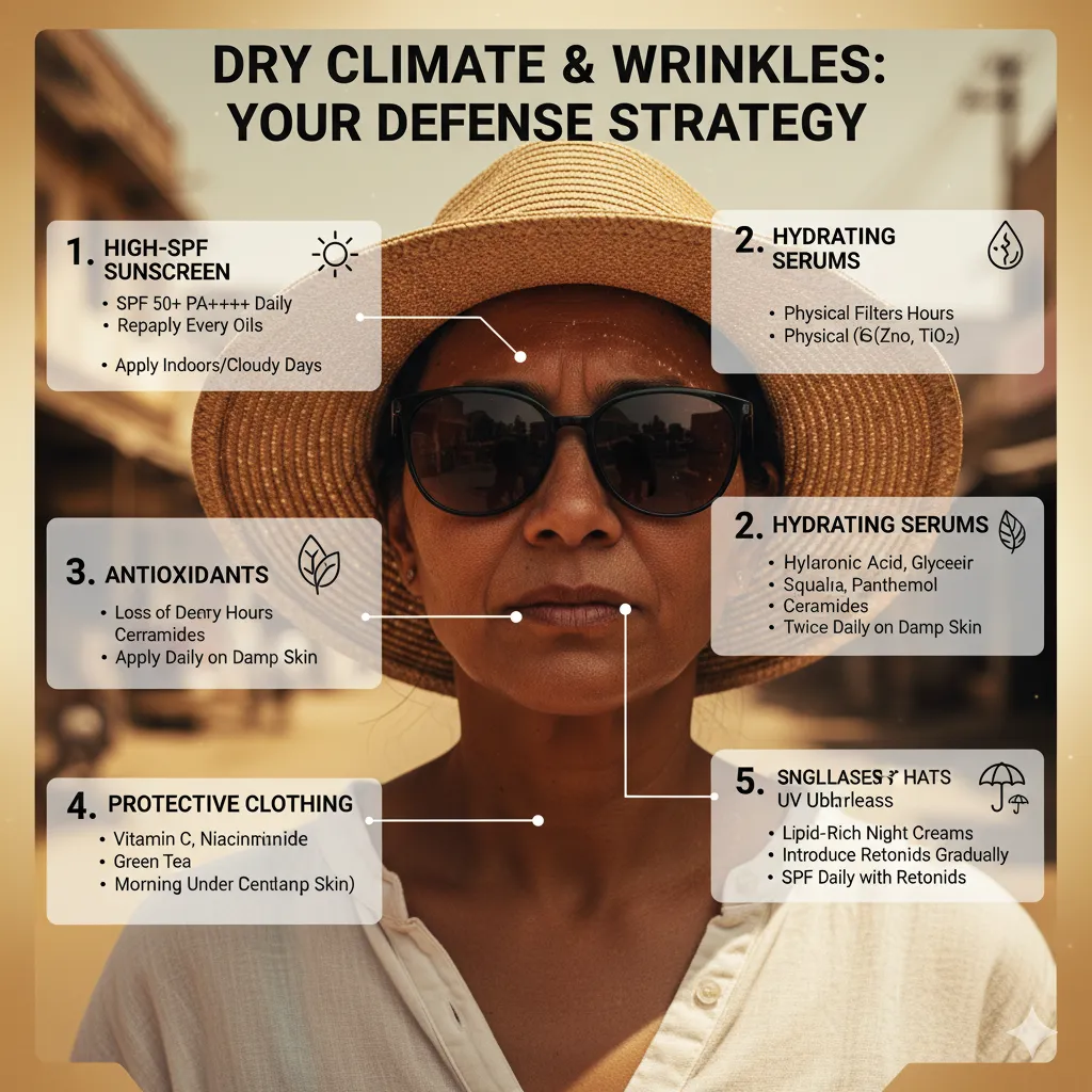 Living in a dry zone means your routine must vary somewhat from others: deep hydration during the day, aggressive protection from the sun, and constant repair. Localized skincare strategies and early awareness can keep your skin youthful and resilient despite the harsh sun.