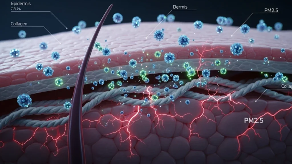 PM2.5 particles | Oxidative stress | Collagen loss, pigmentation |